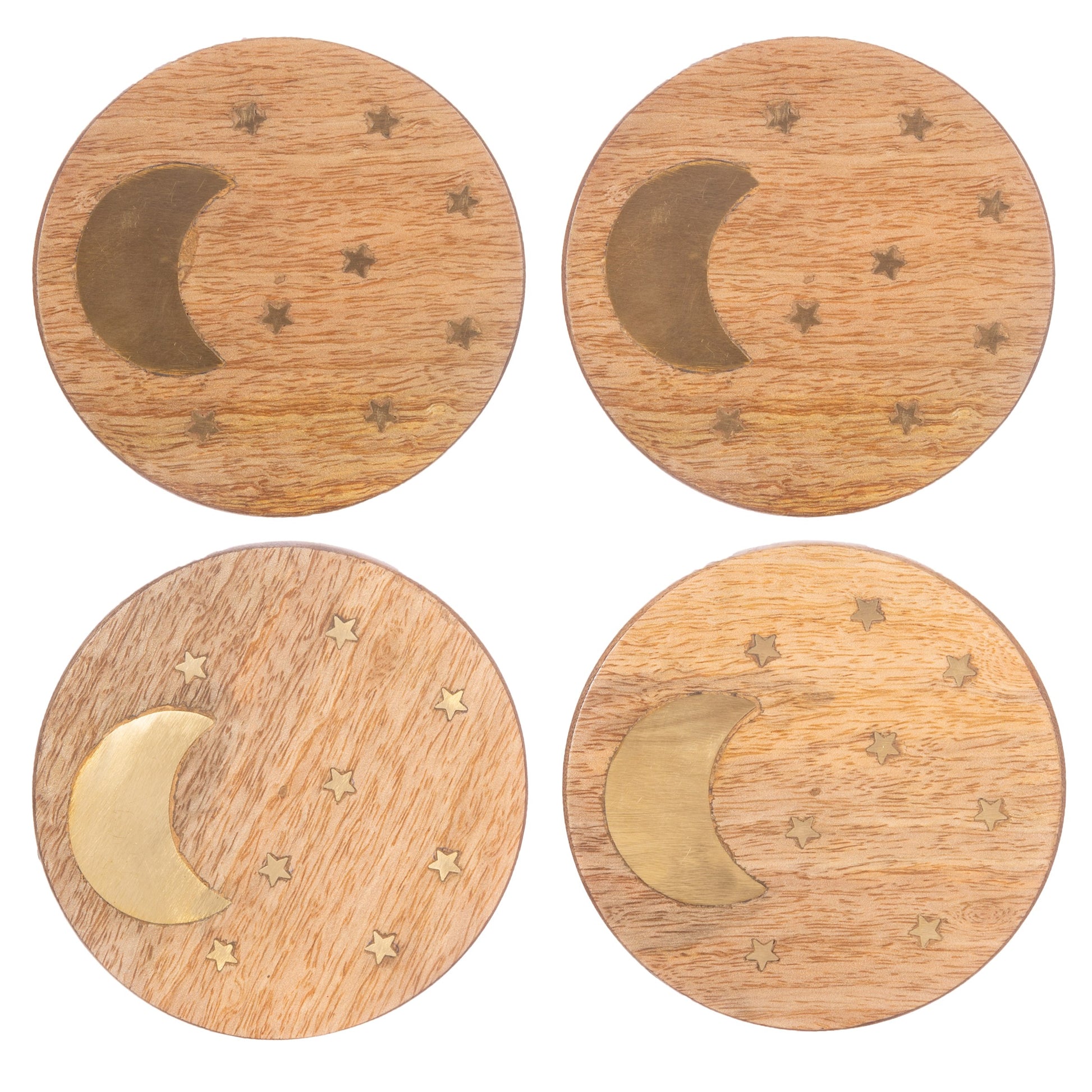 Crafted to showcase a captivating design of stars and crescent moons, each coaster features a sophisticated colourway of natural wood paired with metallic gold accents. The warm wood tones bring organic elegance, whilst the shimmering gold details add a touch of celestial magic to your everyday moments.
